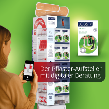 Der neue Leukoplast Presenter unterstützt Ihre Beratung in der Sichtwahl. Mittels eines integrierten Tablets werden Ihre Kunden interaktiv beraten und finden so selbstständig immer das richtige Pflaster. Zusätzlich können Kundinnen und Kunden per QR Code am Smartphone detaillierte Infos zu einzelnen Artikeln abrufen. Eine der vier Seiten ist JOBST Travel Stützstrümpfen gewidmet. Exklusiv über PROVEN erhältlich.
